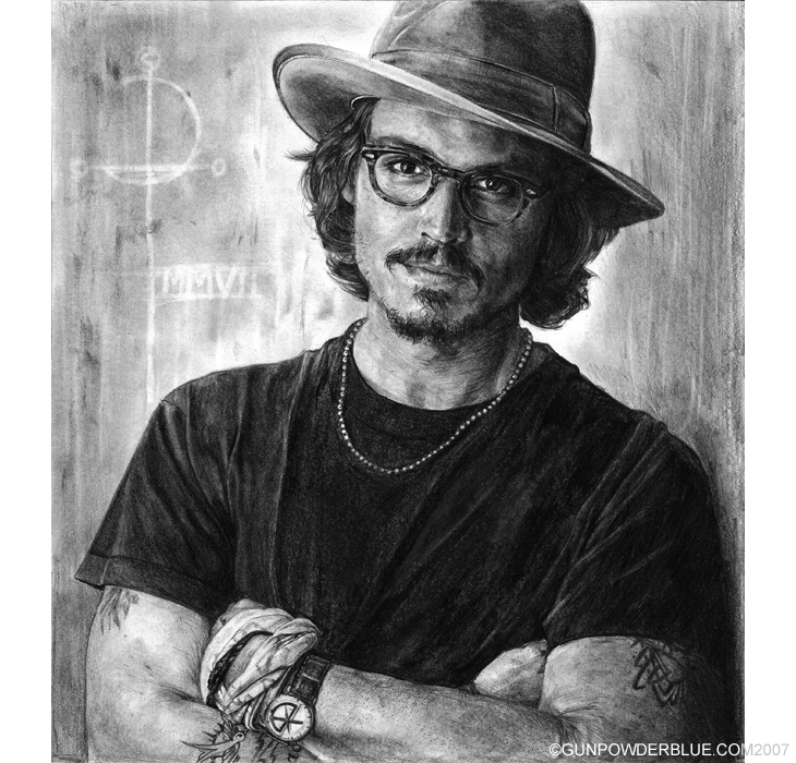 Pencil. 2007. Gift for mumsie. I’ve drawn a few of Johnny Depp as gifts or commissions. He’s played a lot of interesting characters, hasn’t he. I think one of my favourites is Edward Scissorhands. It’s a gothic fairytale about an ‘artificial’ man, clad in black leather, with scissors for hands. It contains themes of identity, self discovery, truth, Beauty and the Beast, along with much social commentary and elements of cyborg theory. Of course, the true beastliness is the ‘conventional’ neurosis outside Edward’s beautiful gothic world. Edward is symbolic of sincerity amid a false, clichéd world that in truth is more harmful than the bladed hands which prevent him from some aspects of human interaction, but which he uses only to create works of art. I’ve always found it resonant.