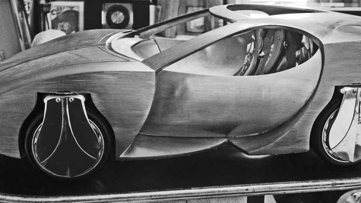 First, I sketched out a plan and profile, with accurate packaging. That allows me to ‘see’ the design in my minds eye. I let ideas evolve, but I rarely move into 3D without knowing where lines are going to go. I did not do a pile of sexy marker renderings with 25 inch wheels, zero ground clearance and windows only a cockroach could see out of! Instead, I modelled it in cardboard. I then produced a more accurate technical package, quarter scale, and sculpted the quarter scale clay. This was finished and cast in fibreglass extremely quickly, as the greater part of the work was finishing and fitting out the inside, and working out the mechanisms for the sliding door etc.